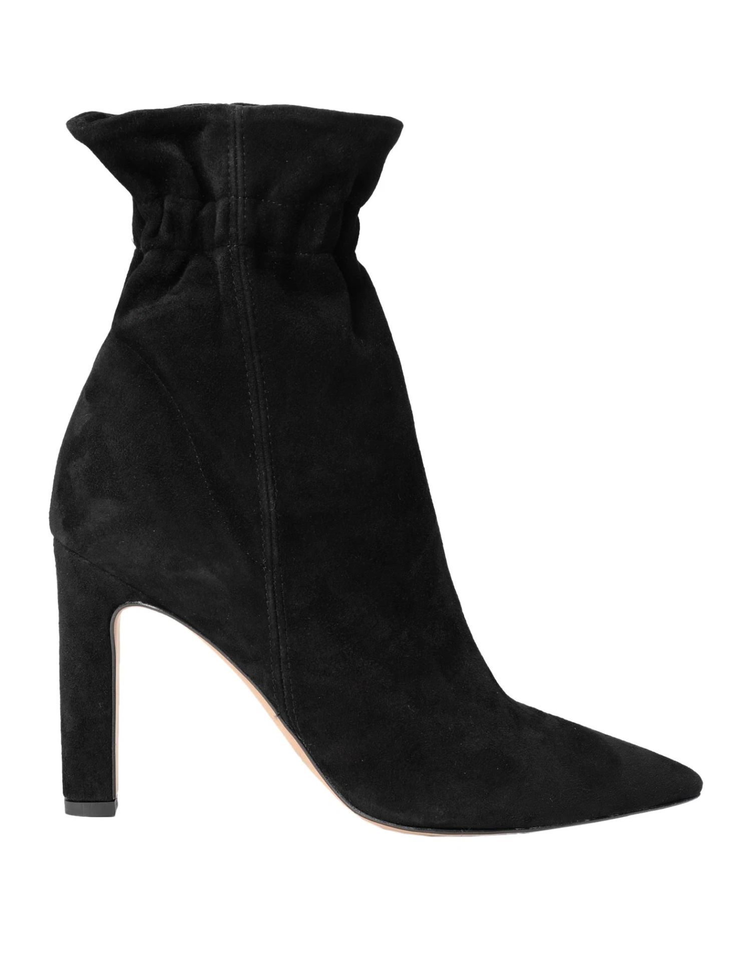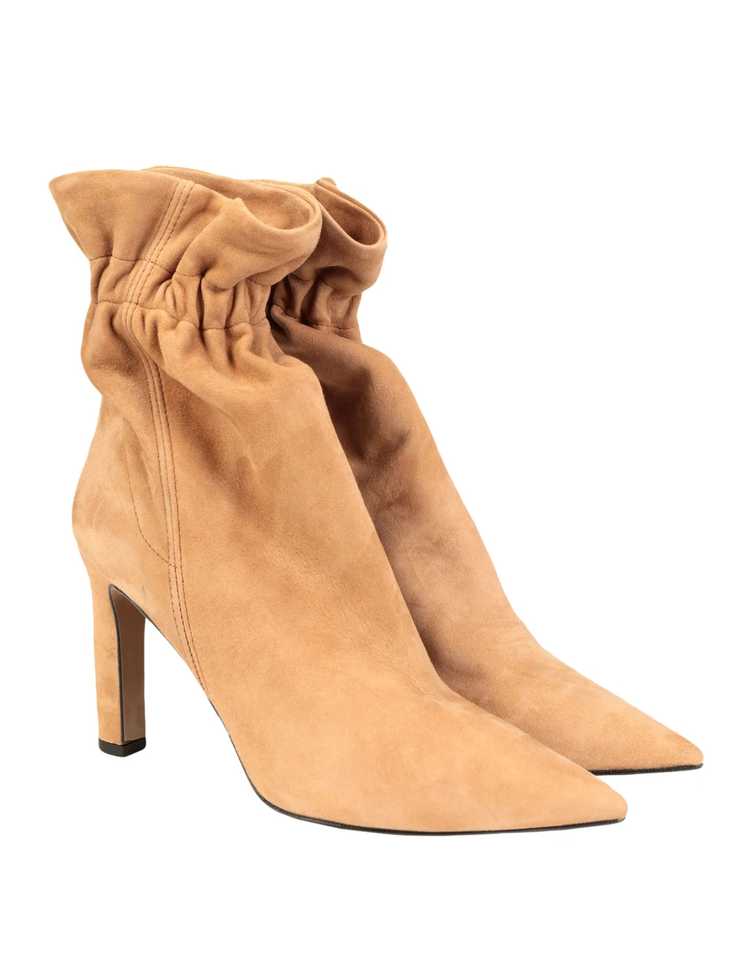 suede effect, frills, basic solid color, elasticized gores, narrow toeline, square heel, covered heel, fully lined, rubber sole, contains non-textile parts of animal origin