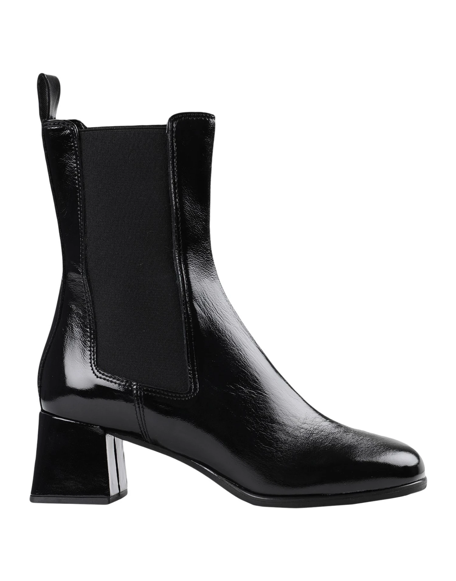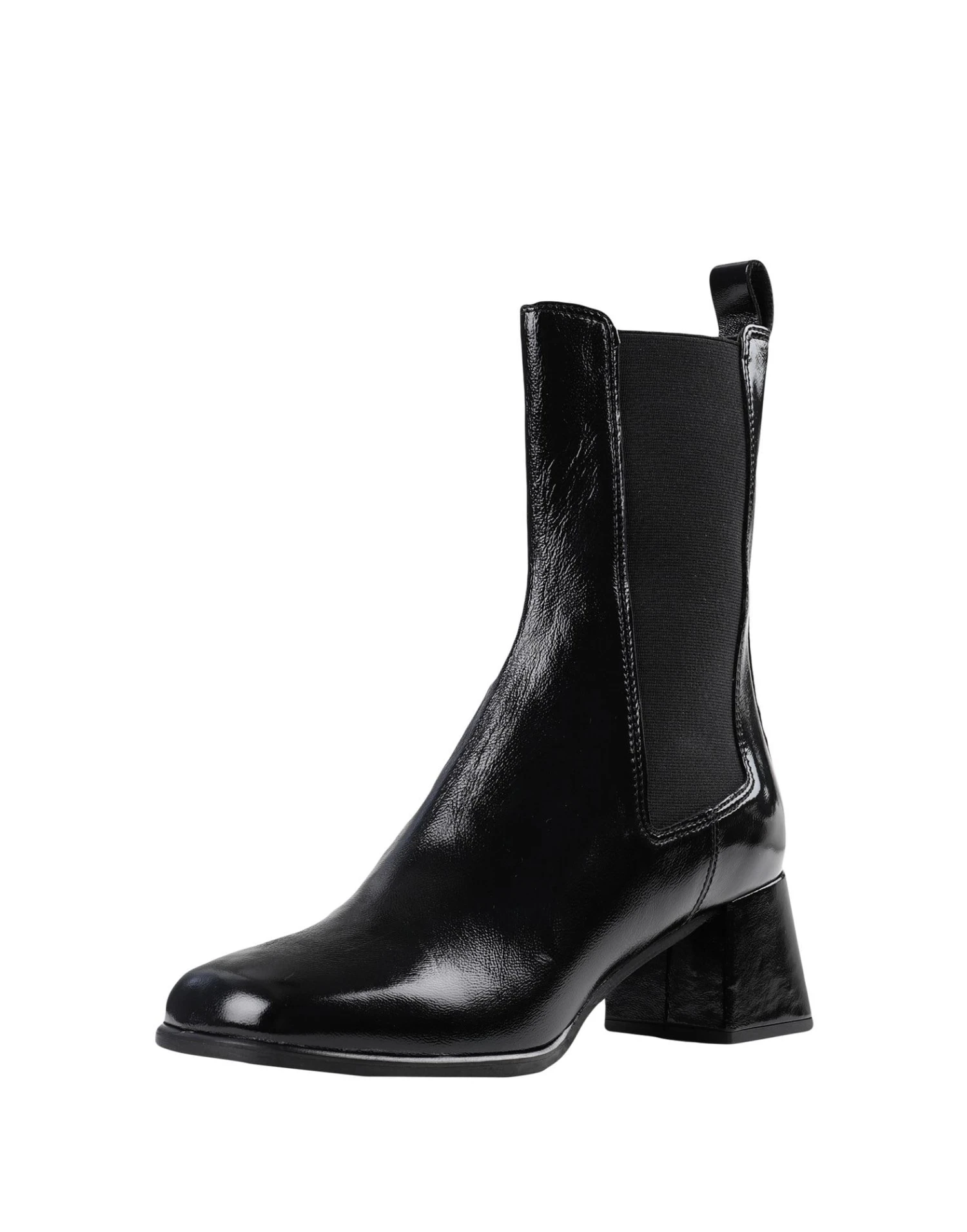 varnished effect, no appliqués, solid color, elasticized gores, square toeline, square heel, covered heel, leather lining, rubber sole, contains non-textile parts of animal origin