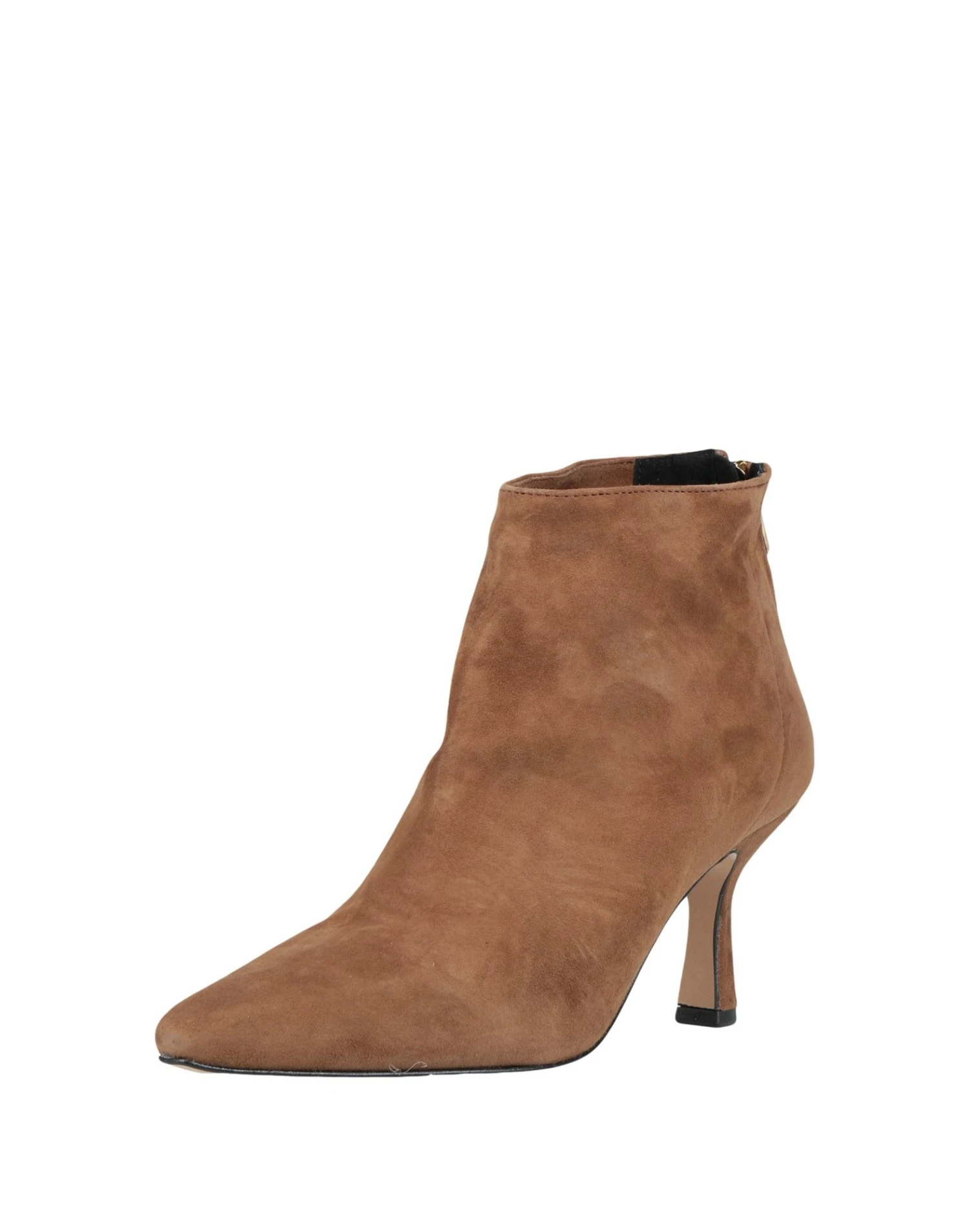 solid color, leather backing, zipper closure, spool heel, rubber sole, round toeline, suede effect, no appliqués, contains non-textile parts of animal origin
