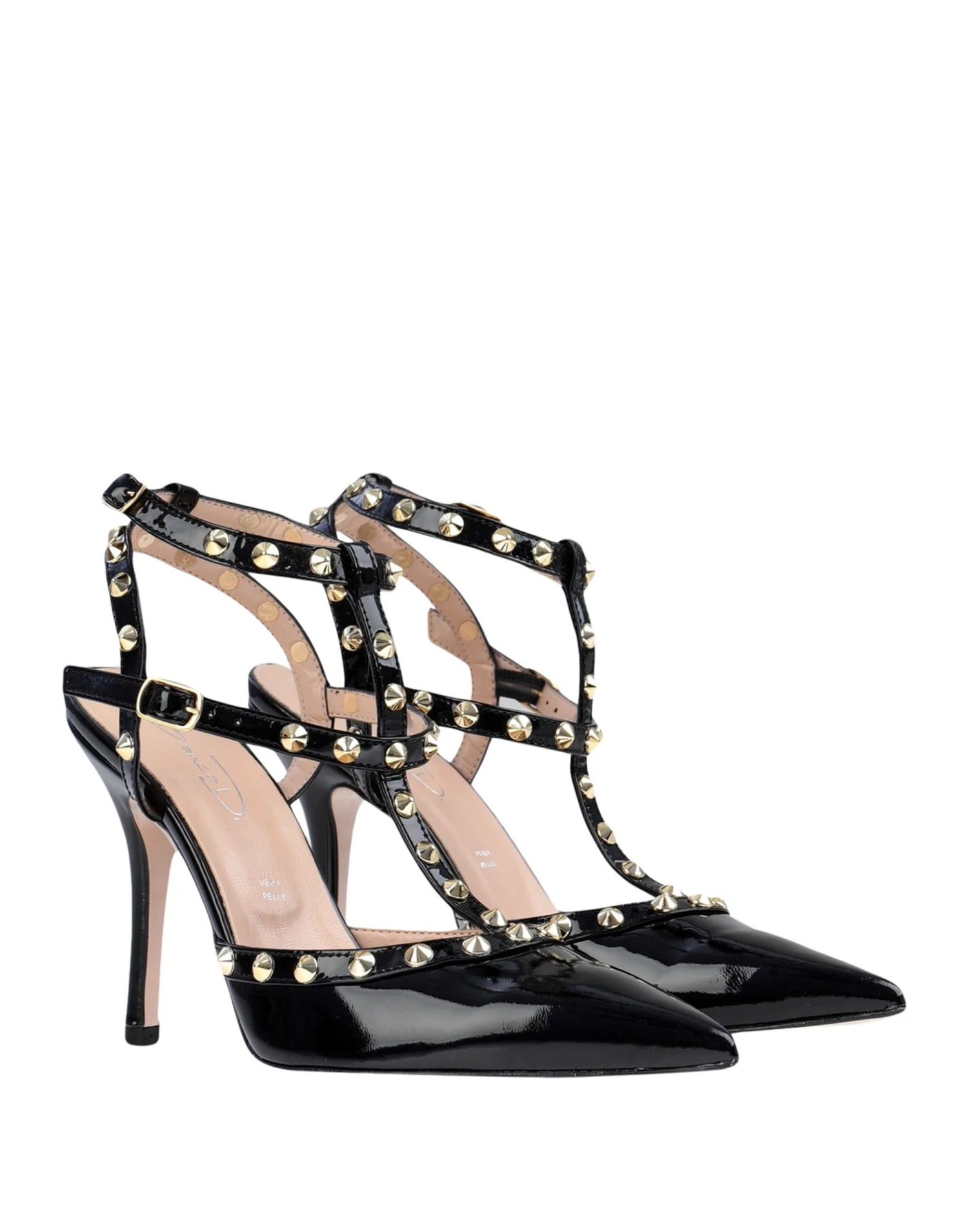 varnished effect, studs, basic solid color, buckle, narrow toeline, spike heel, covered heel, fully lined, rubber sole, contains non-textile parts of animal origin, sling-backs