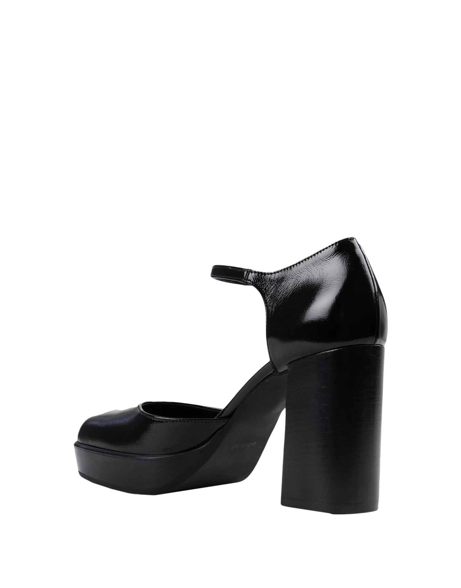 varnished effect, no appliqués, solid color, buckle fastening, round toeline, square heel, leather lining, rubber sole, contains non-textile parts of animal origin