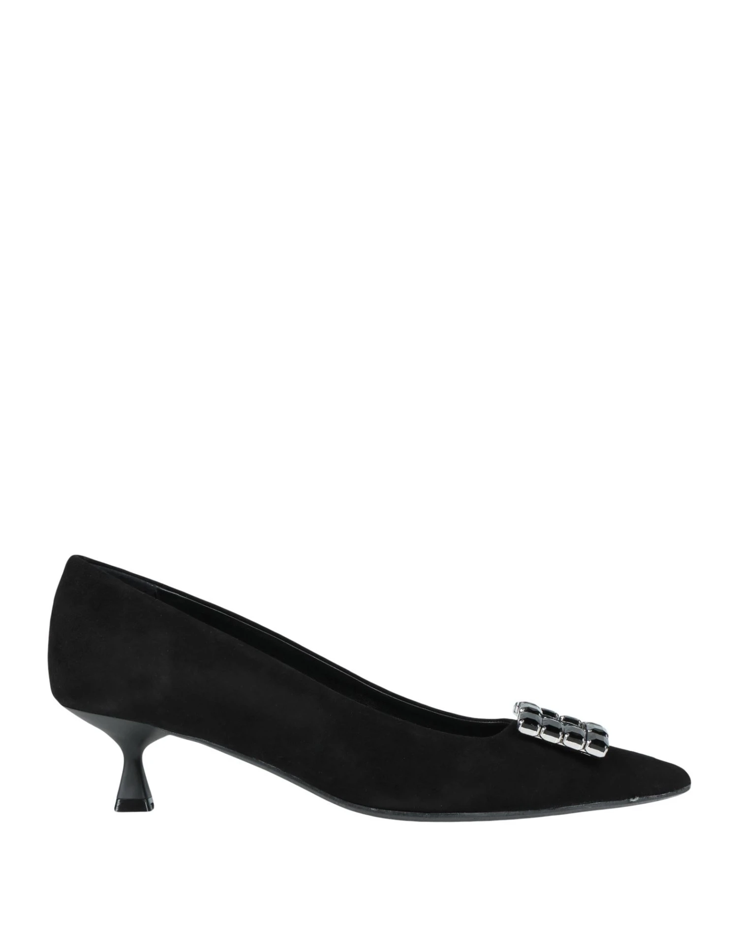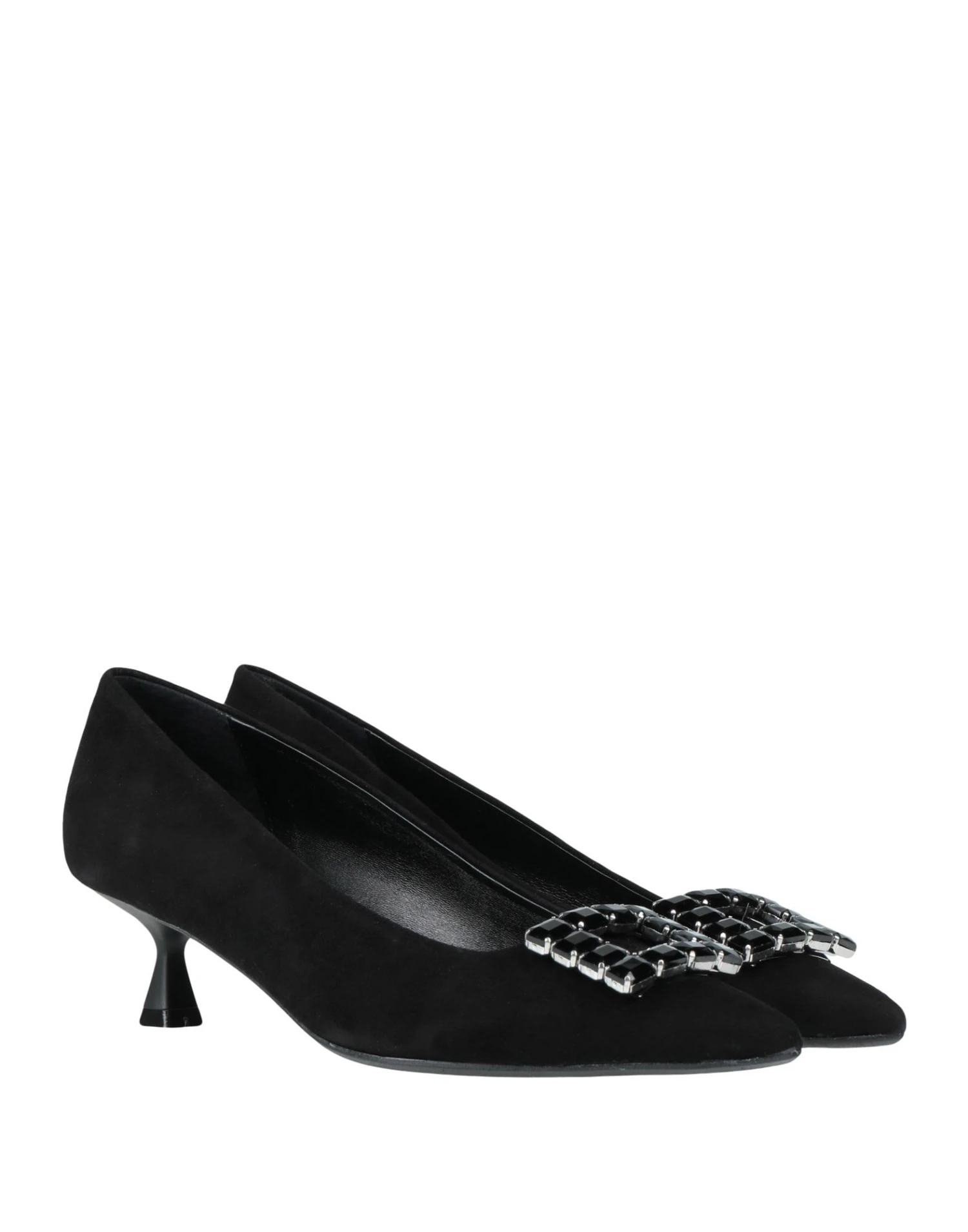 suede effect, rhinestones, solid colour with appliqués, leather backing, narrow toeline, spool heel, rubber sole, contains non-textile parts of animal origin