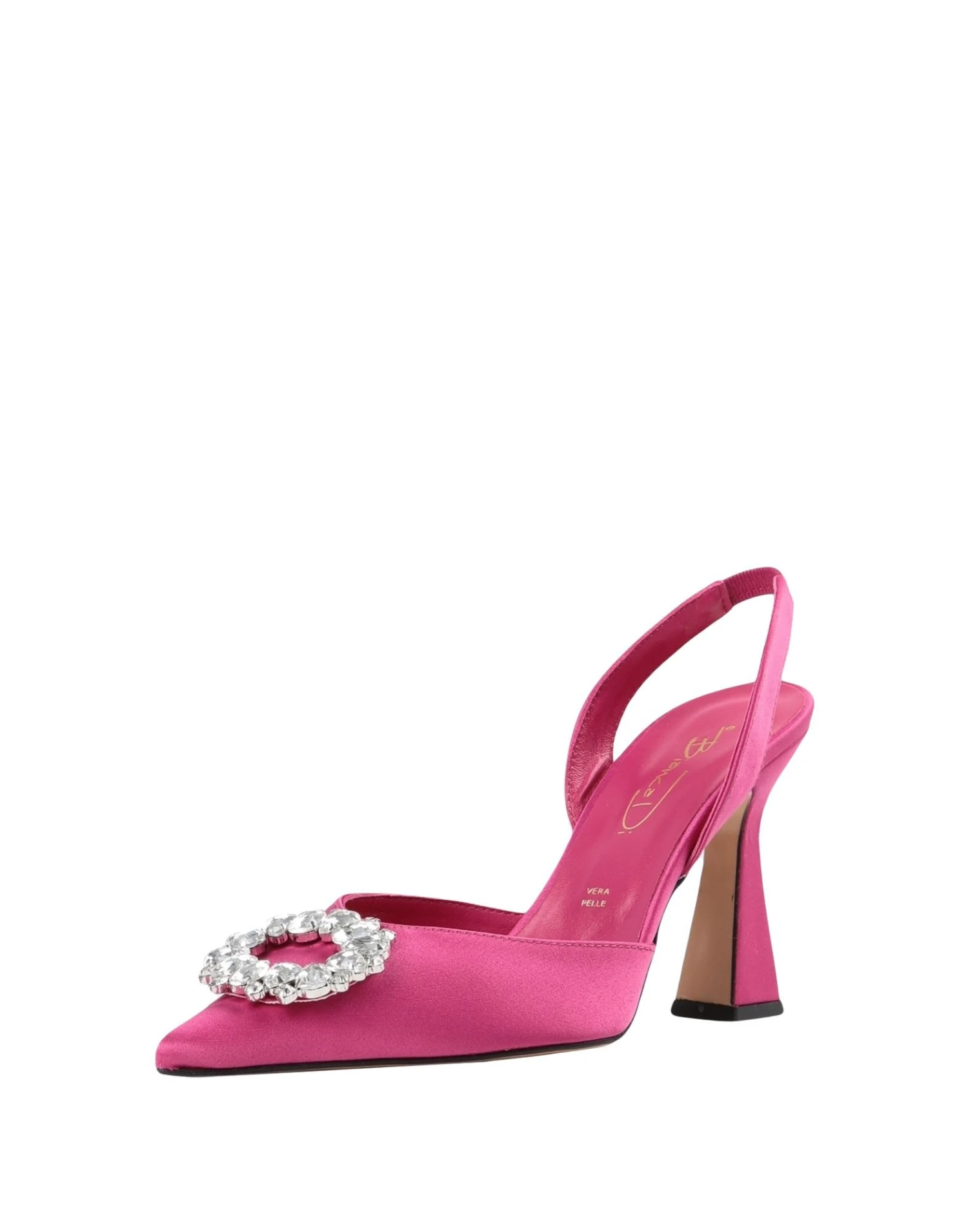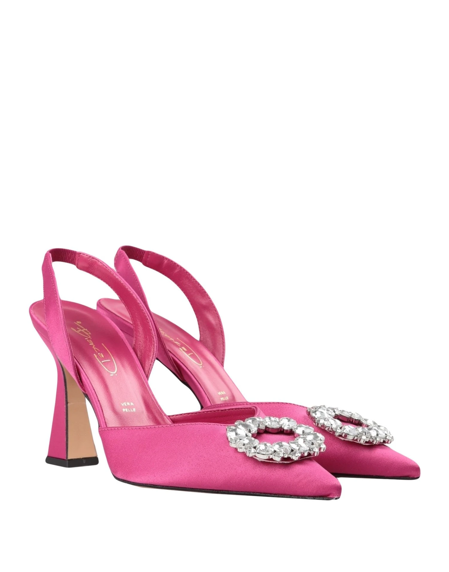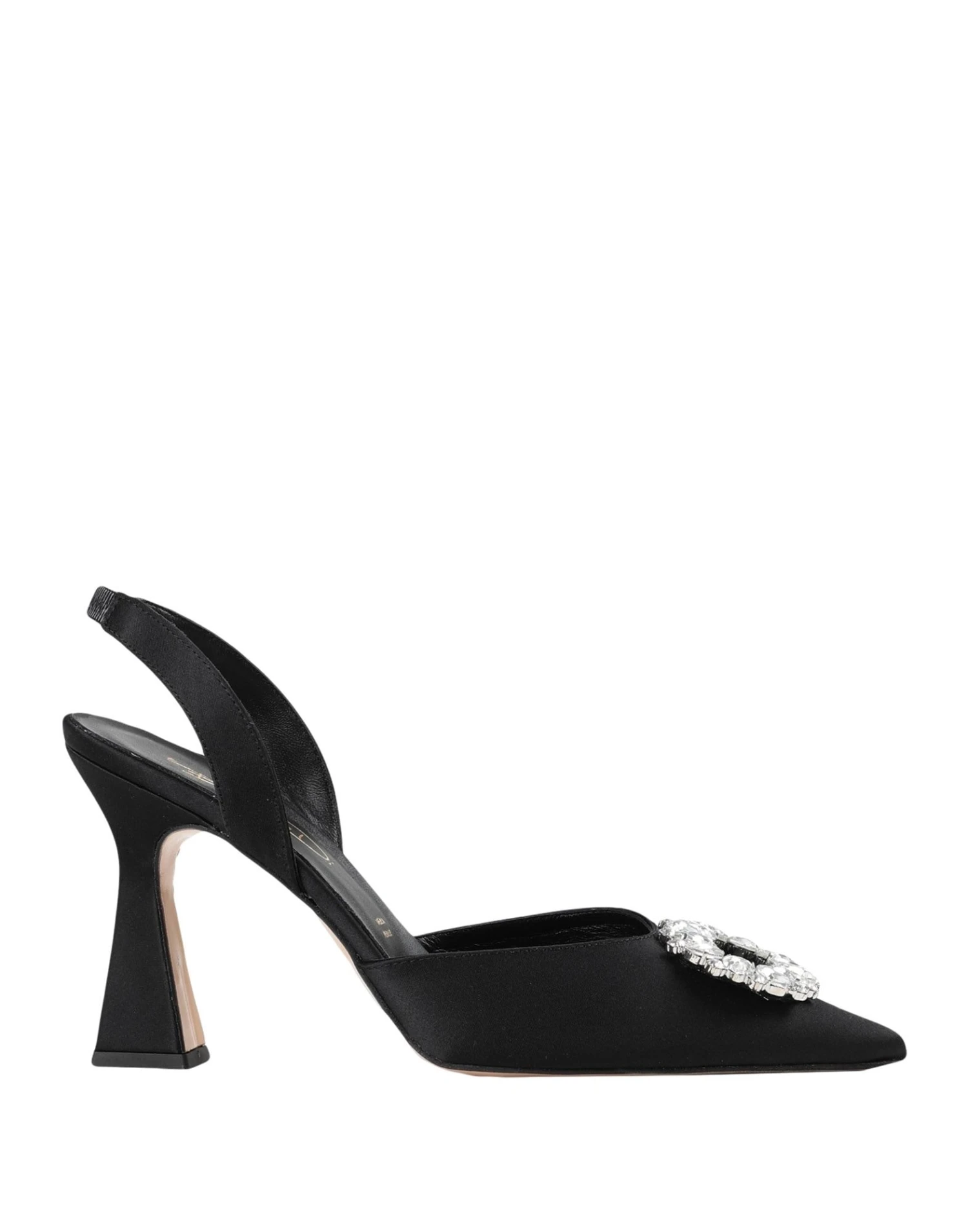 satin, crystals, solid colour with appliqués, elasticized gores, round toeline, leather sole, leather lining, spool heel, contains non-textile parts of animal origin