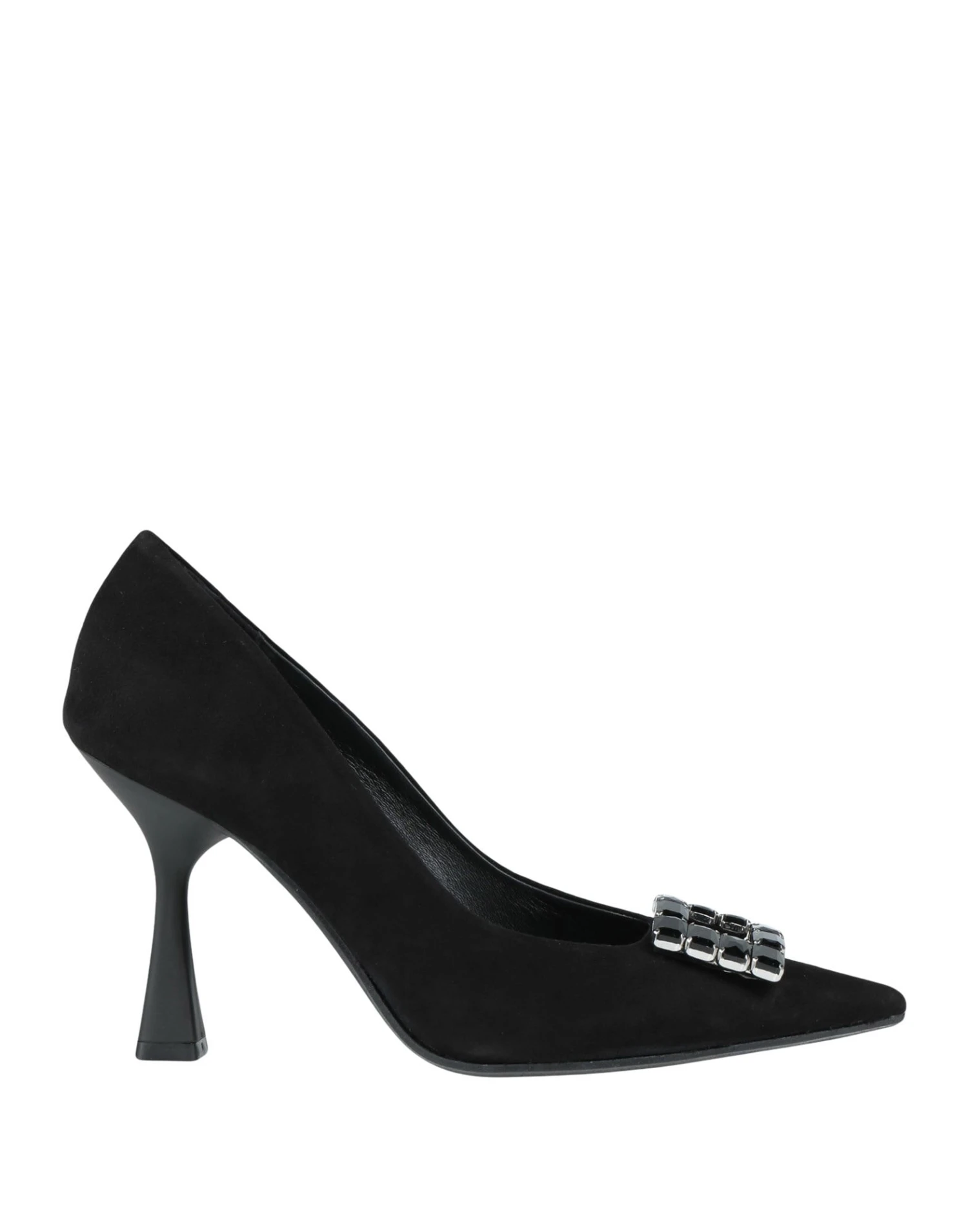 suede effect, rhinestones, solid colour with appliqués, leather backing, narrow toeline, spool heel, rubber sole, contains non-textile parts of animal origin