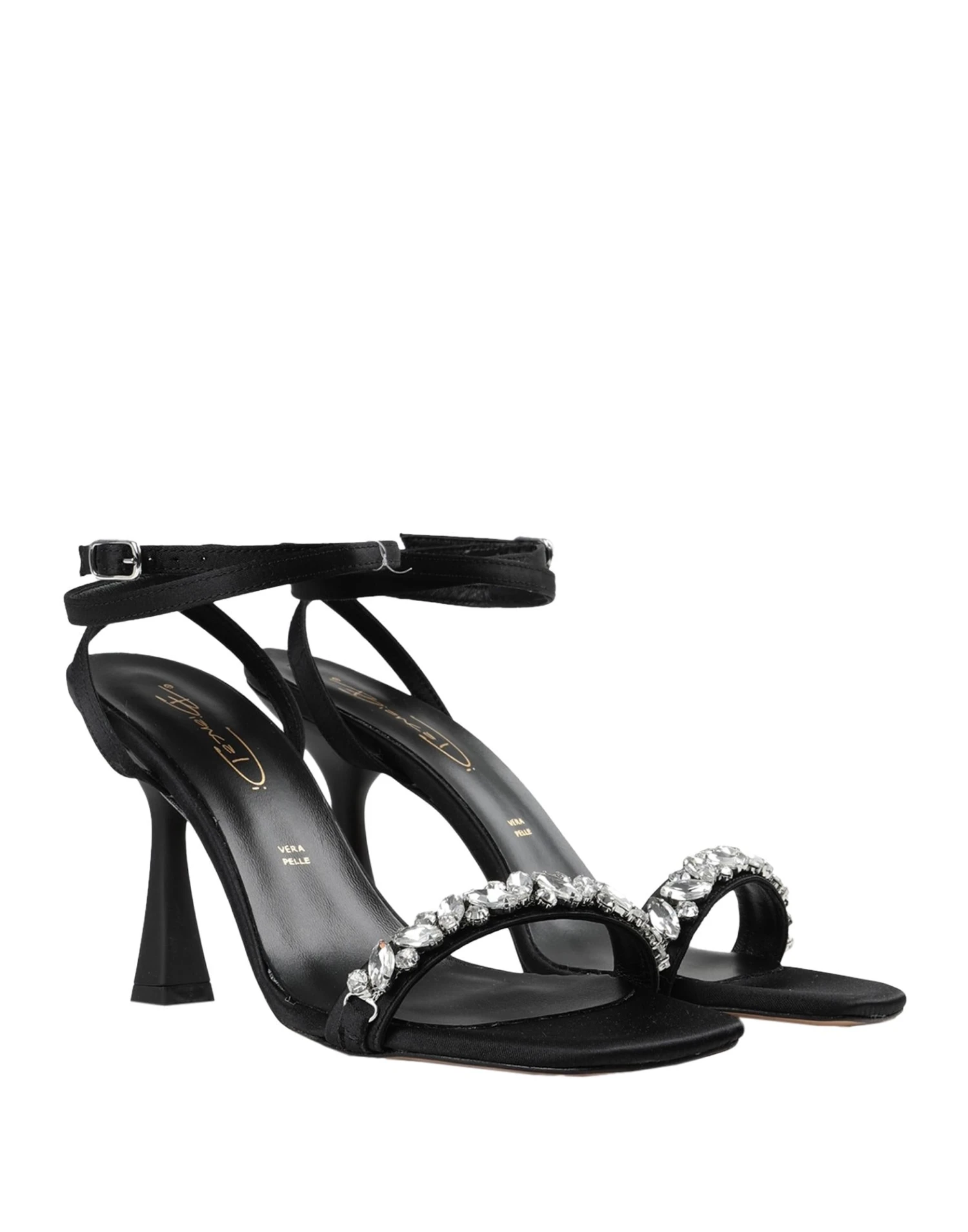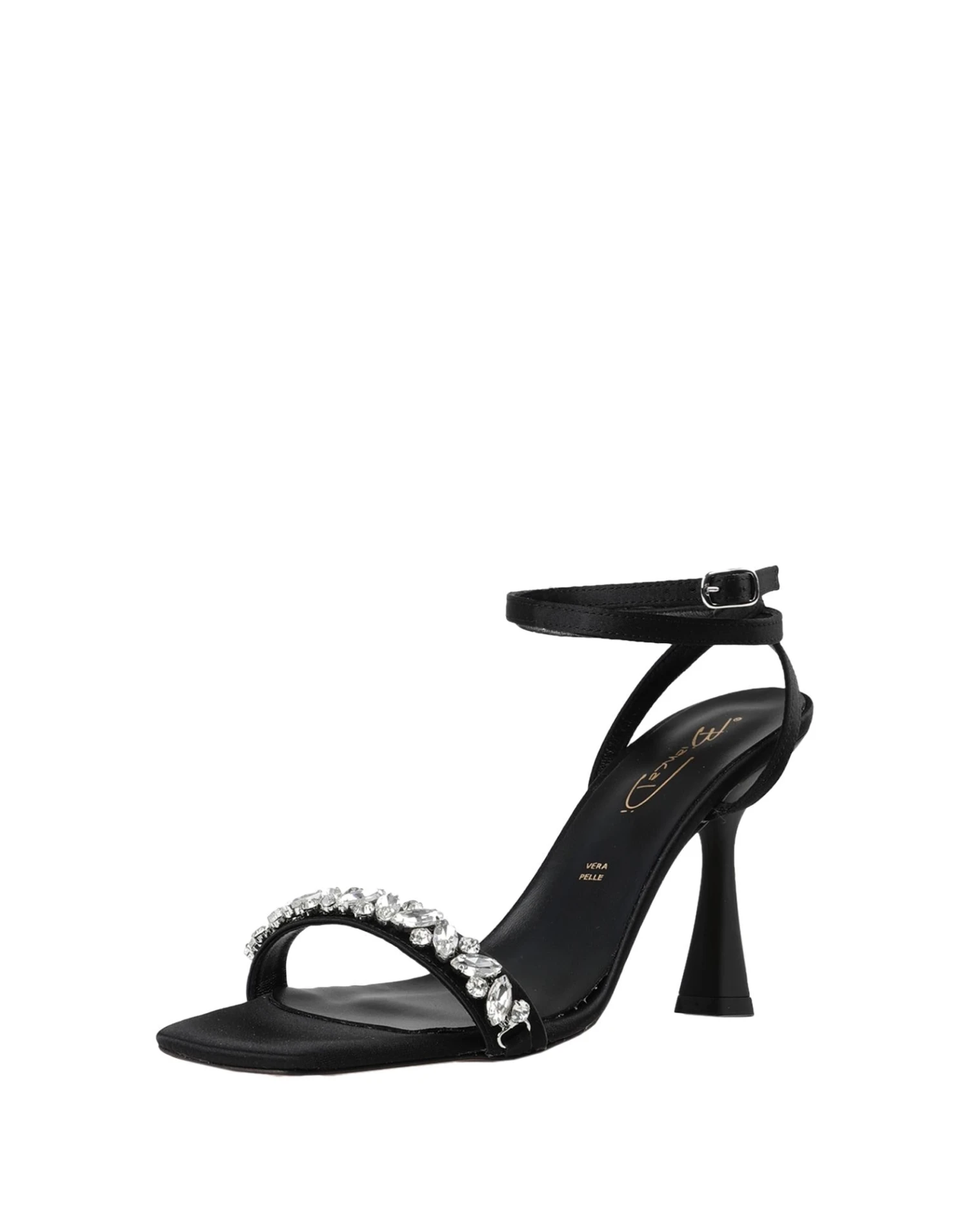 satin, crystals, solid colour with appliqués, buckle fastening, square toeline, leather sole, spool heel, leather lining, contains non-textile parts of animal origin