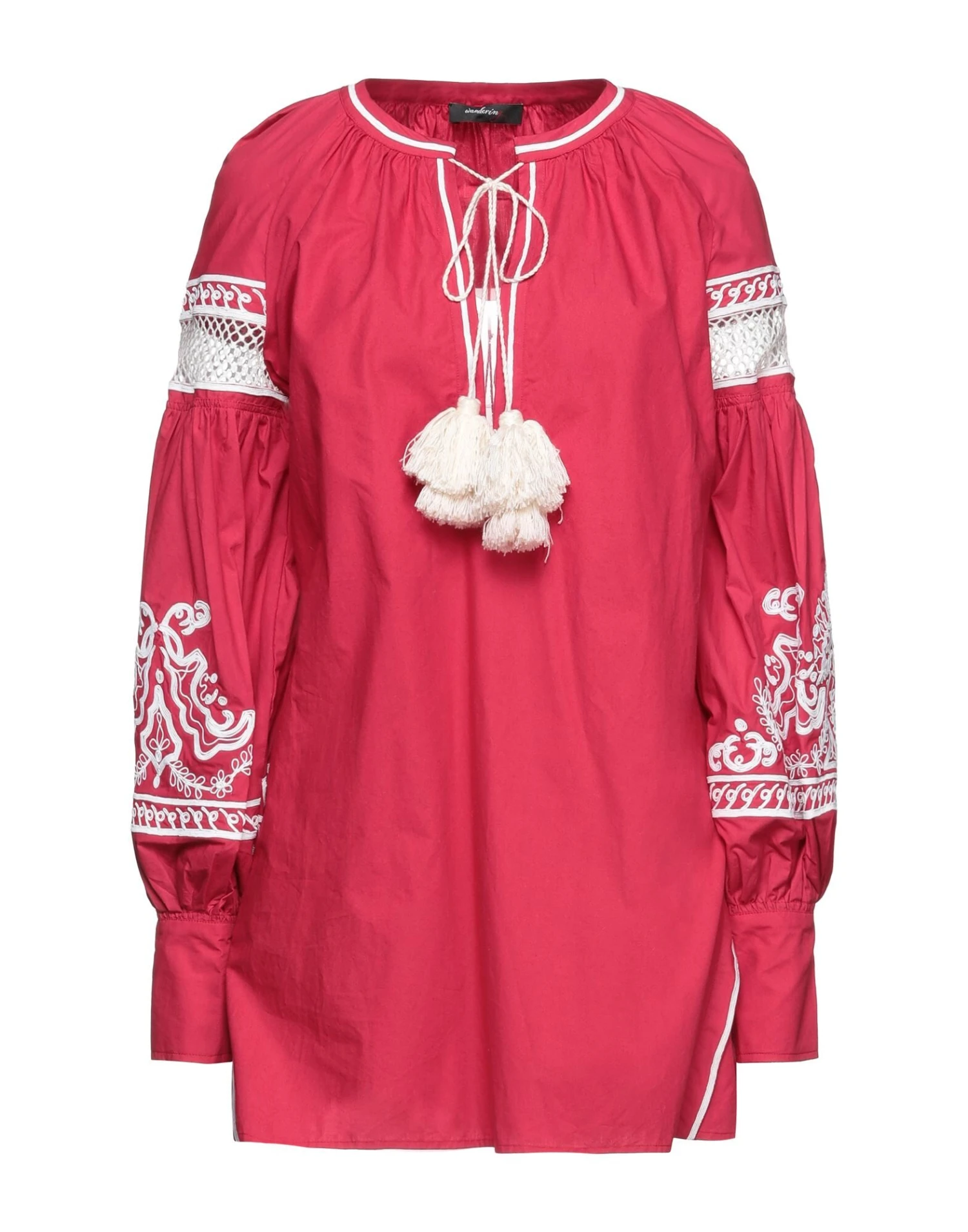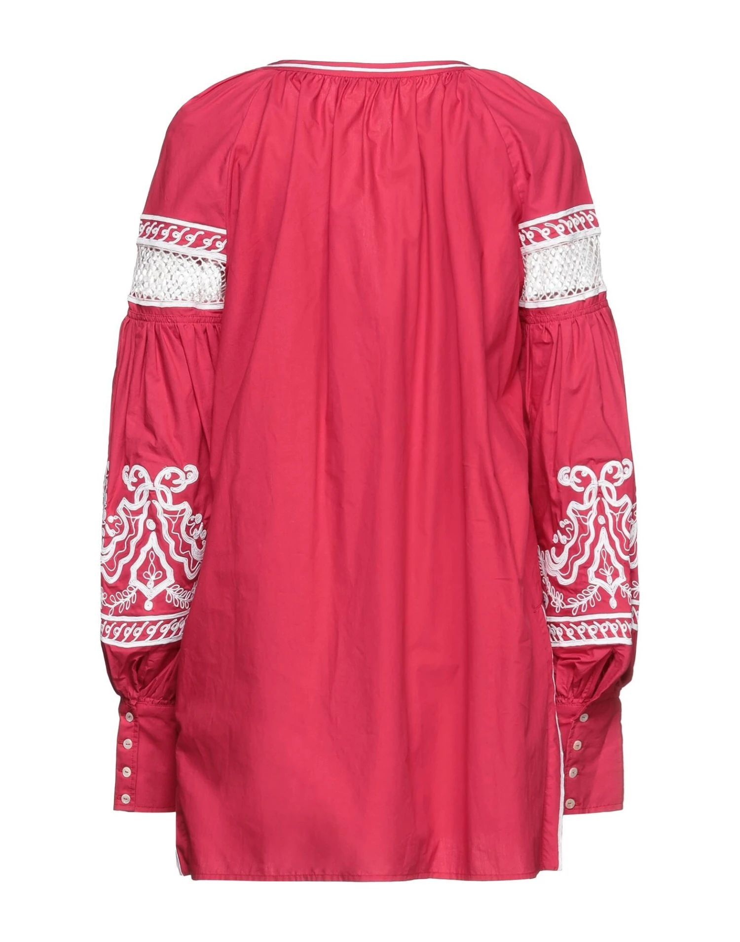 lace, plain weave, contrasting applications, solid color, bow collar, long sleeves, buttoned cuffs, unlined, no pockets
