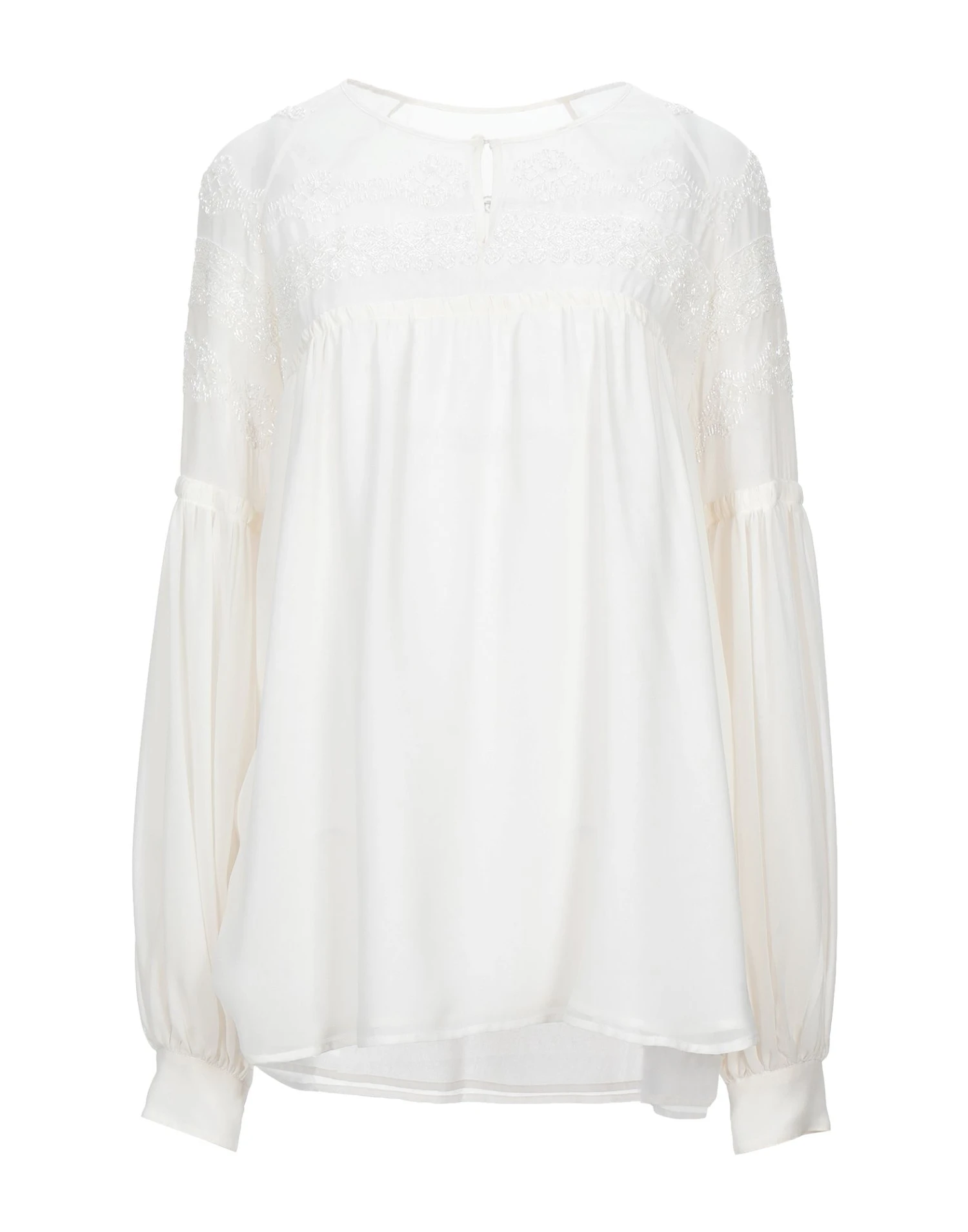 crepe, frills, contrasting applications, basic solid color, front closure, button closing, long sleeves, buttoned cuffs, round collar, no pockets