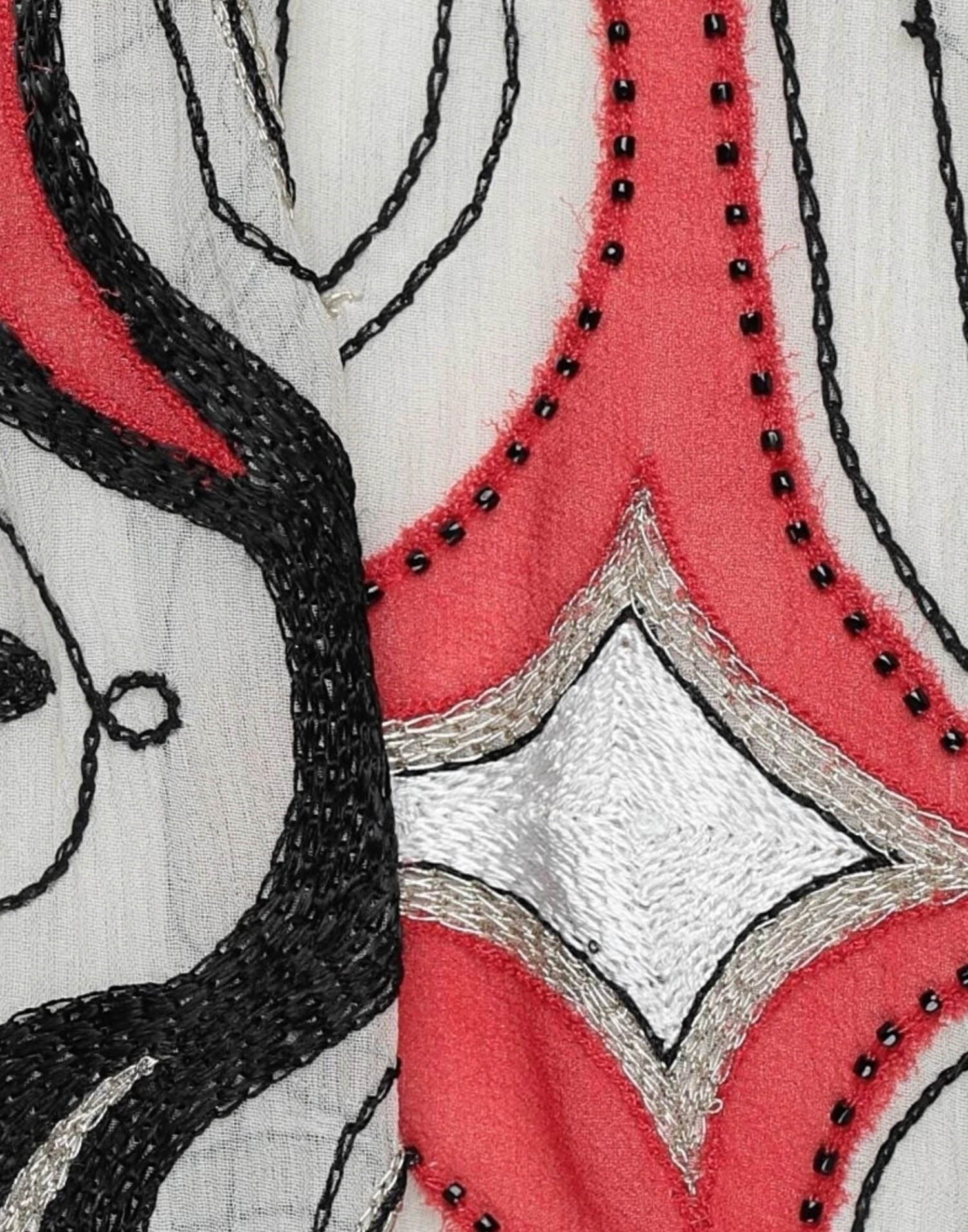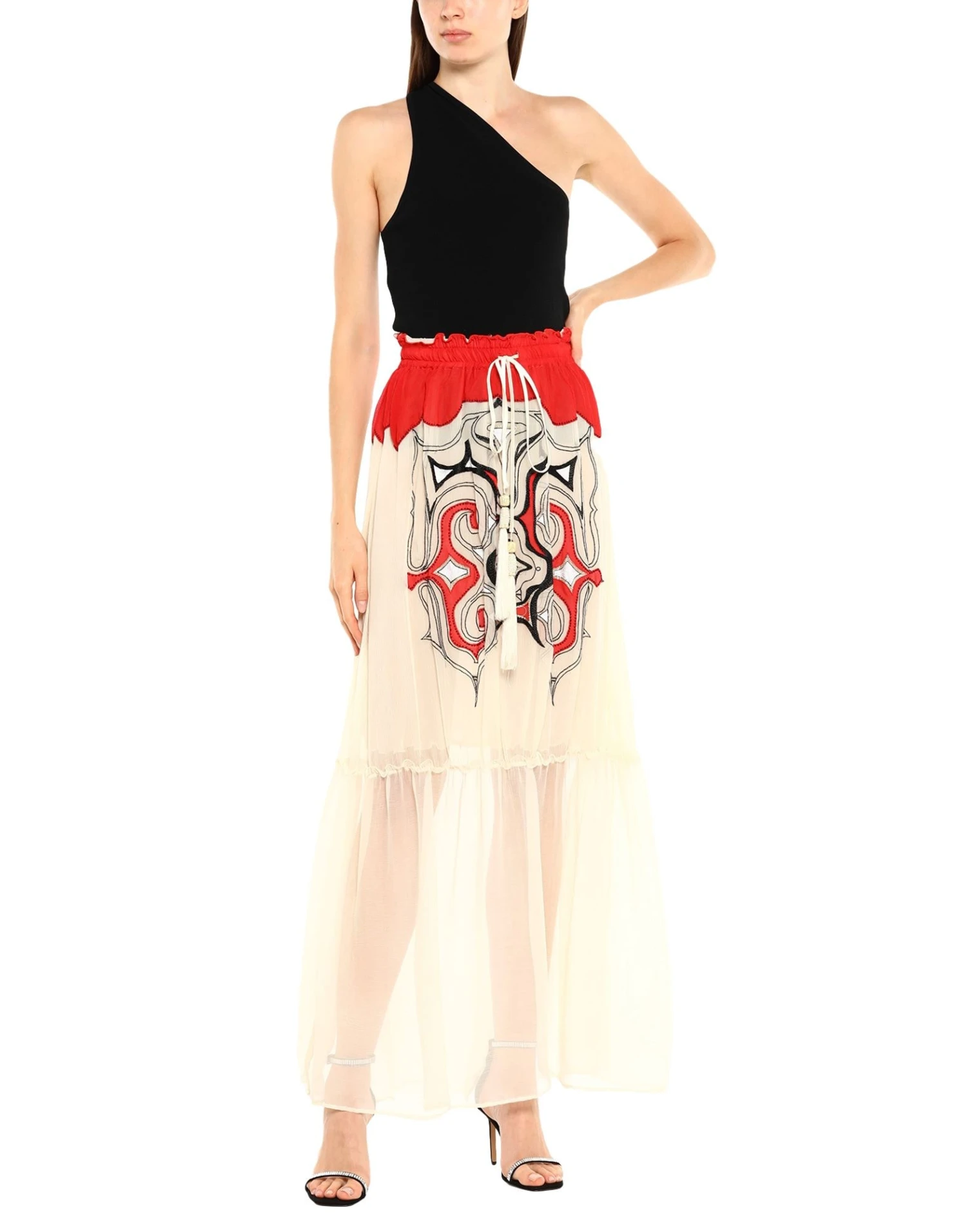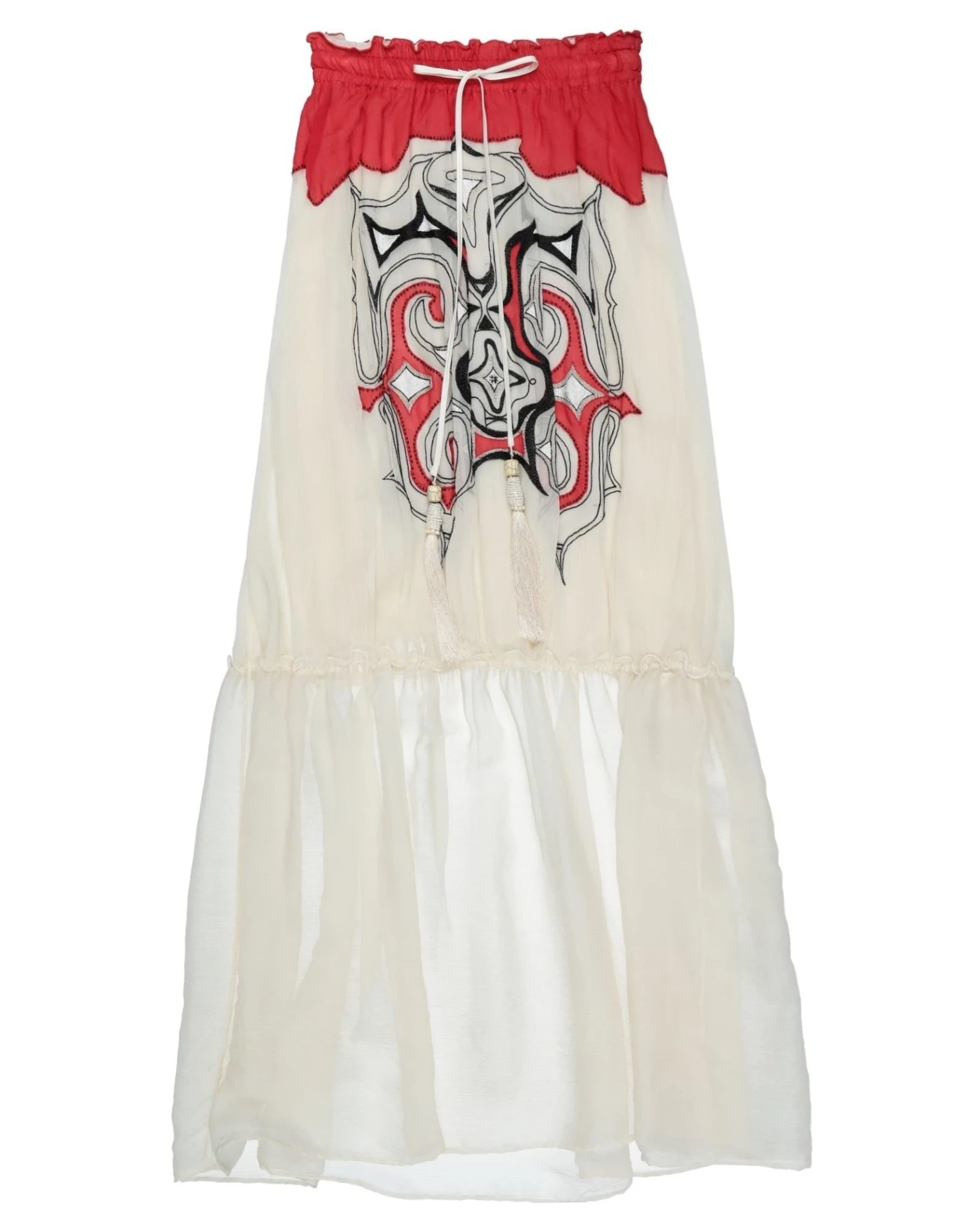crepe, beads, embroidered detailing, multicolor pattern, mid rise, drawstring waist, no pockets, partially lined interior