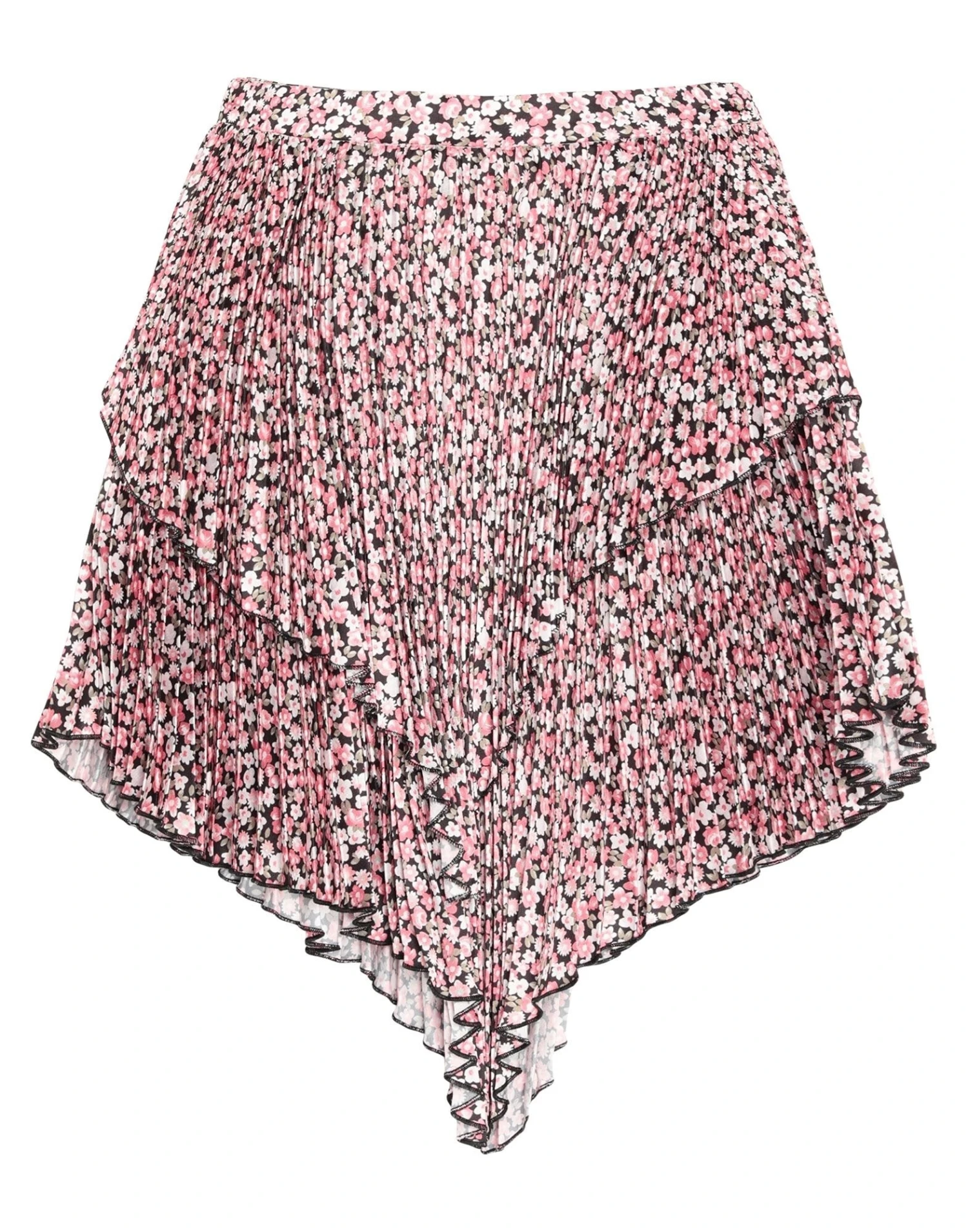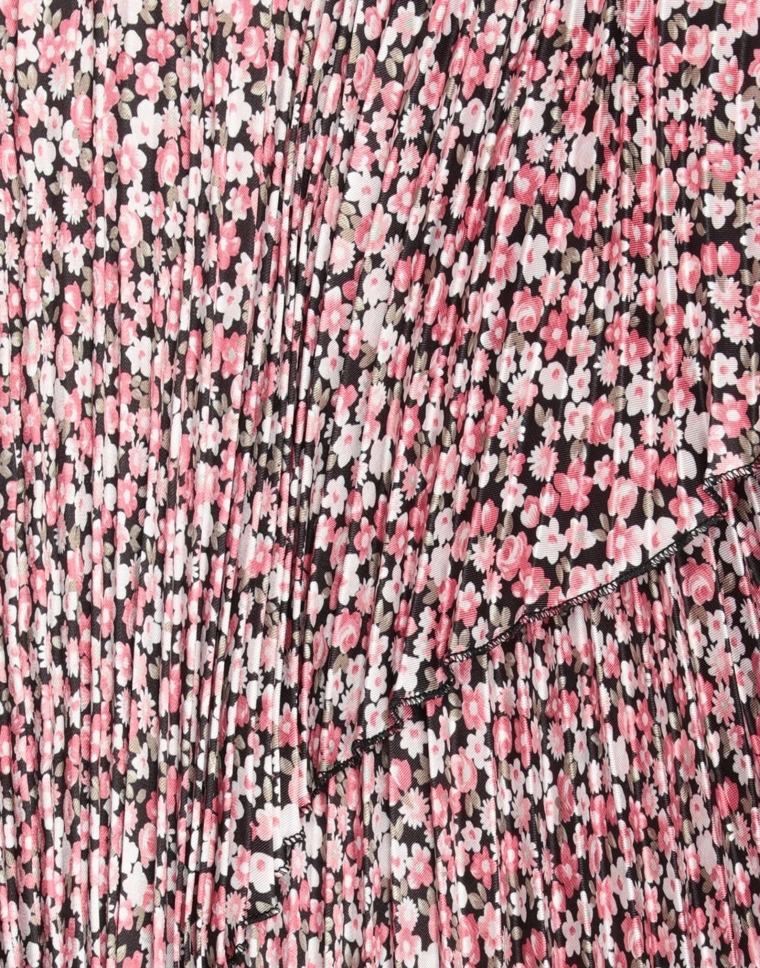 satin, no appliqués, floral design, snap buttons fastening, no pockets, asymmetrical hemline