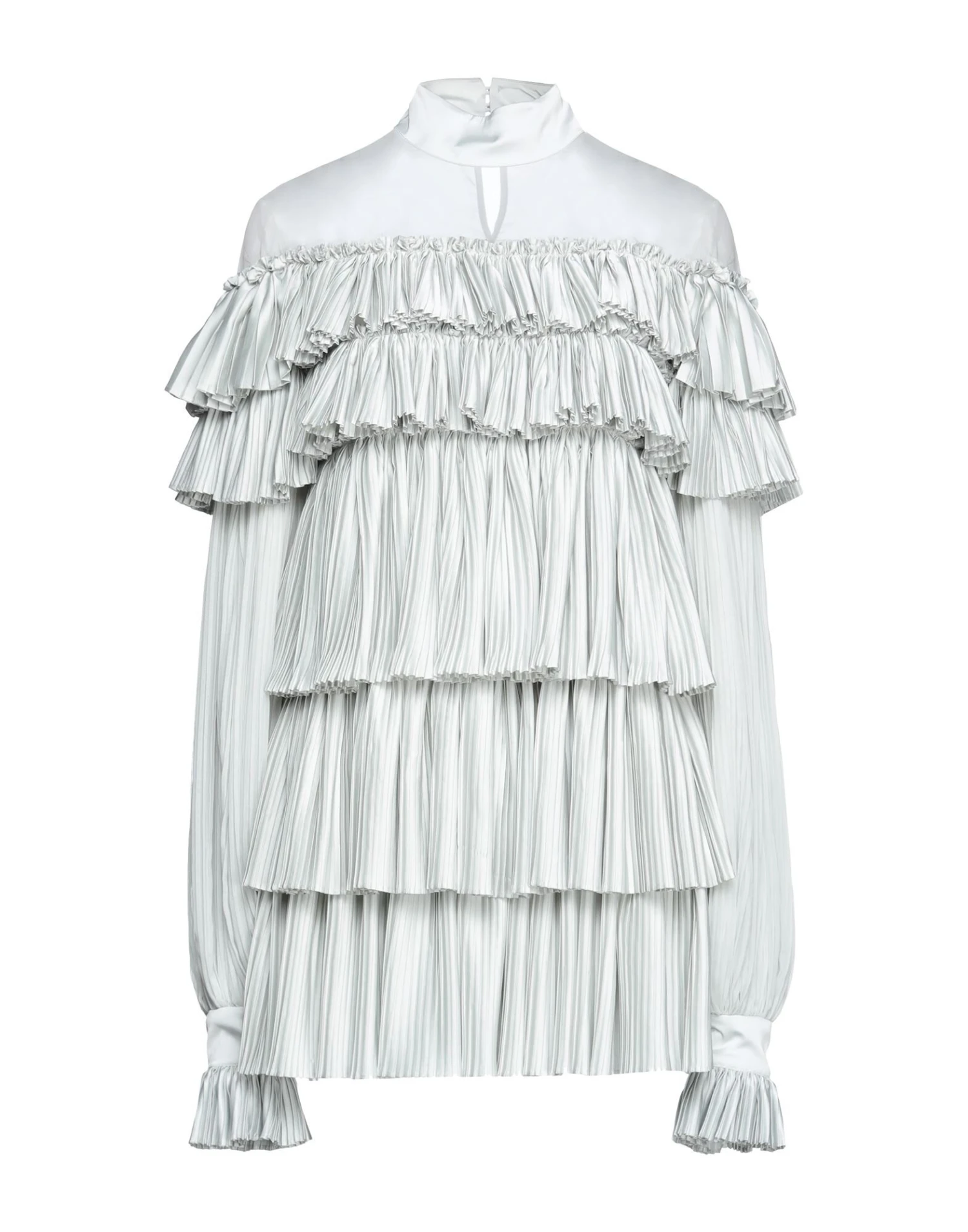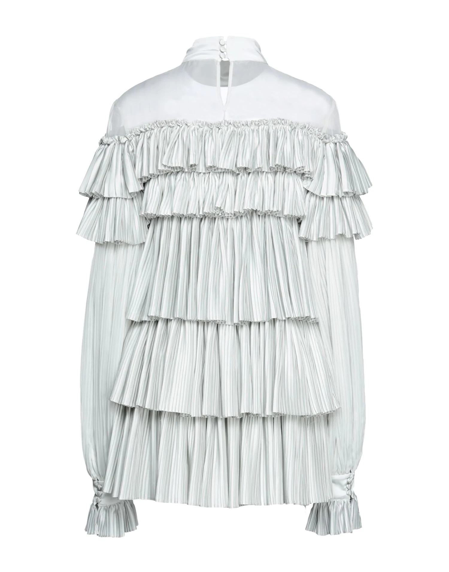 voile, satin, pleated, ruffles, solid color, turtleneck, long sleeves, unlined, no pockets, stretch